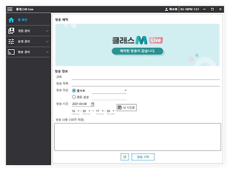 | 캠 방송 | 캠 화면을 통한 학습을 지원하며 학생 화면을 확인 할 수 있습니다. |
